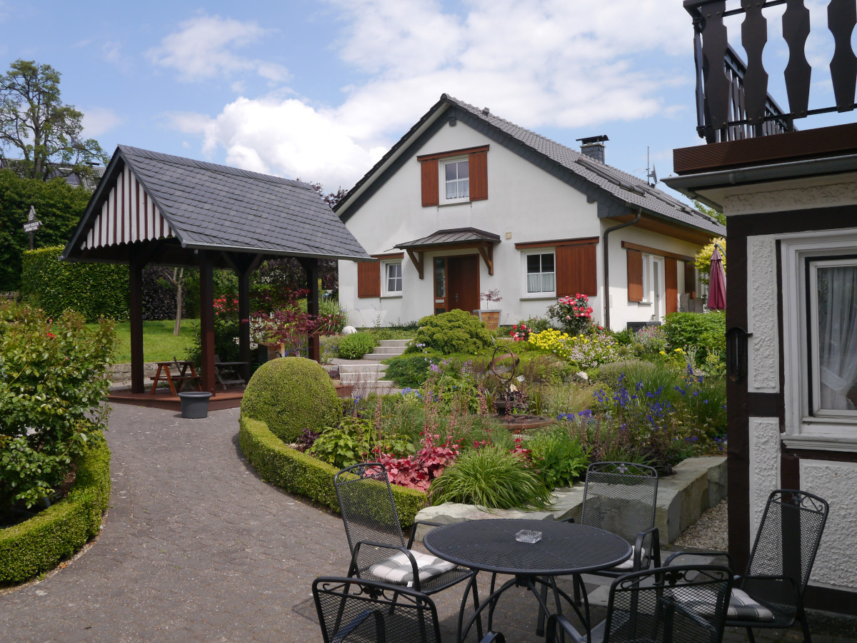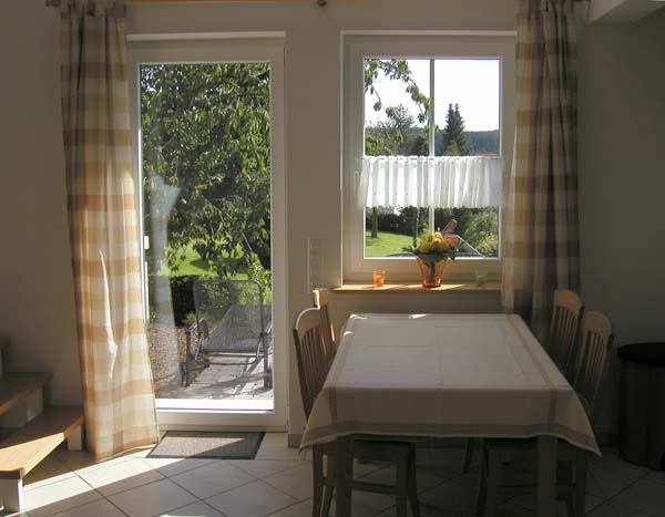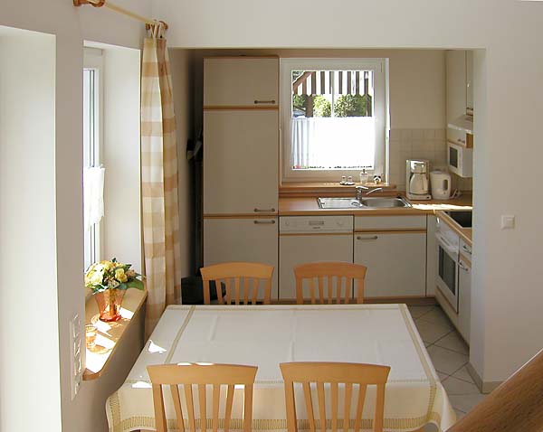 Die Ferienwohnung befindet sich in einer 2003 erbauten Doppelhaushälfte auf dem großen Grundstück des Hofes. Sie besitzt einen separaten Eingang und eine eigene Südterrasse. Im Erdgeschoss der zweigeschossigen Wohnung befinden sich ein Wohn- und Essraum mit einer offenen Küche, ein Schlafzimmer und ein Bad mit Dusche und WC. Über eine offene Treppe erreicht man die Schlafgalerie und das zweite Bad. Die Wohnung verfügt über einen eigenen Telefon- und Internetanschluss und eine Spülmaschine. Eine Waschmaschine und Trockner können Sie in der Pension mitbenutzen.